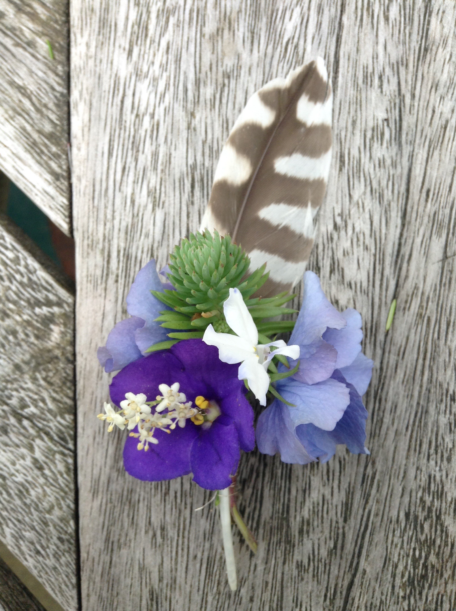 blue and purple buttonholes with feather